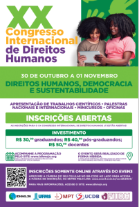 O XX CIDH será realizado de maneira híbrida pela Universidade Federal de Mato Grosso do Sul (UFMS), entre os dias 30 de outubro e 1º de novembro de 2023, com a parceria do Instituto de Direitos Humanos de Mato Grosso do Sul – José do Nascimento (IDHMS-JN), da Universidade Católica Dom Bosco (UCDB) e o apoio de várias Instituições públicas e privadas afinadas com os direitos humanos.