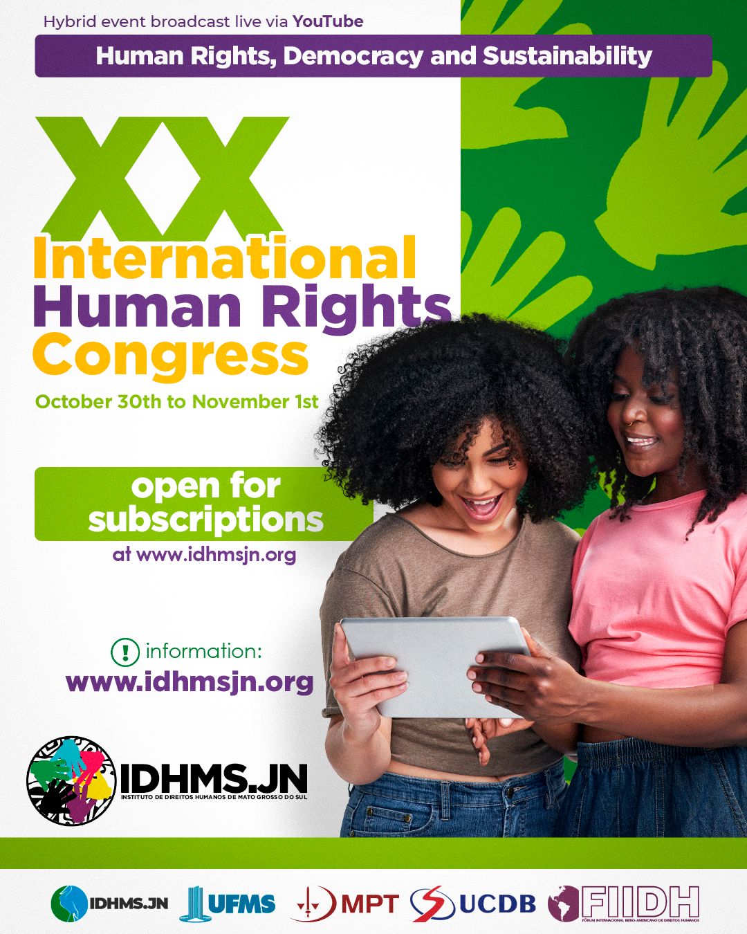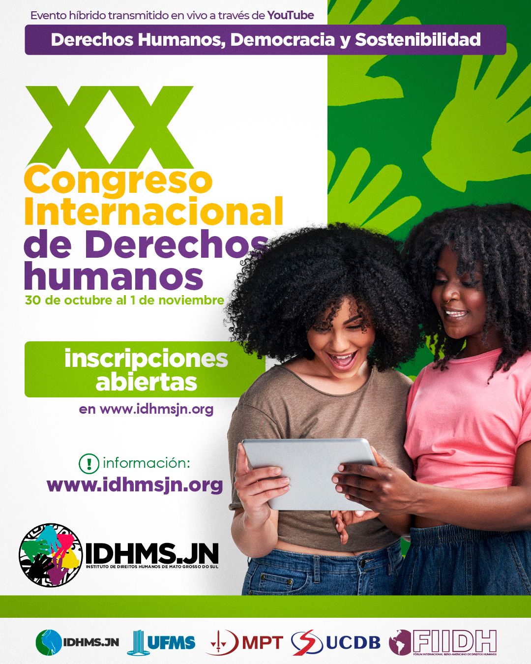 O XX CIDH será realizado de maneira híbrida pela Universidade Federal de Mato Grosso do Sul (UFMS), entre os dias 30 de outubro e 1º de novembro de 2023, com a parceria do Instituto de Direitos Humanos de Mato Grosso do Sul – José do Nascimento (IDHMS-JN), da Universidade Católica Dom Bosco (UCDB) e o apoio de várias Instituições públicas e privadas afinadas com os direitos humanos.