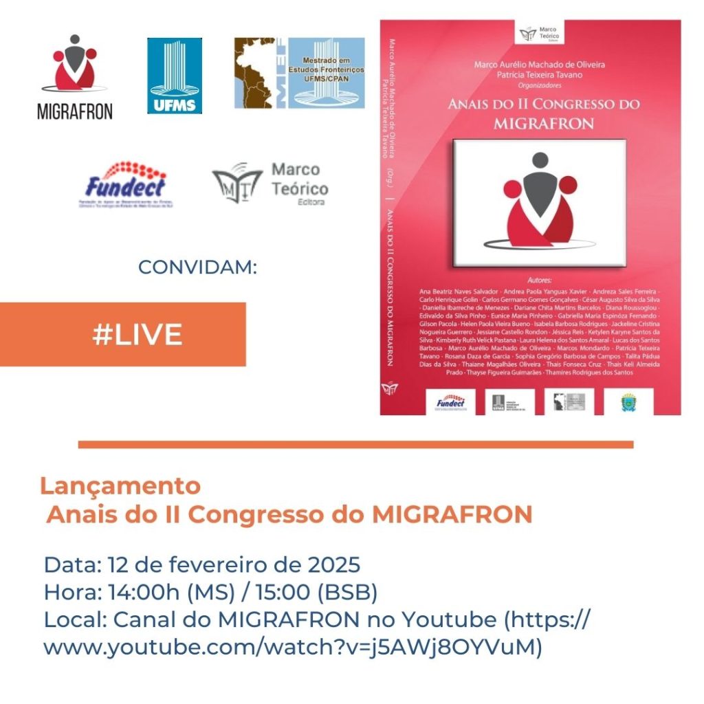 No dia 12 de fevereiro de 2025 acontecerá um importante evento, o lançamento do Anais do II Congresso do Observatório Fronteiriço das Migrações – MIGRAFRON. O evento acontecerá às 14h horário de Mato Grosso do Sul), e poderá ser acessado no Link(https://www.youtube.com/watch?v=j5AWj8OYVuM).