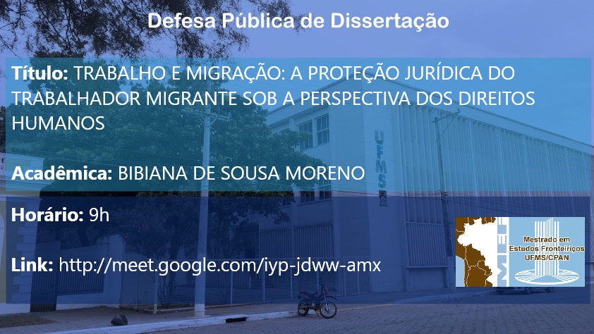 O Programa de Pós-Graduação em Estudos Fronteiriços convida para a Defesa Pública de Dissertação da mestranda BIBIANA DE SOUSA MORENO, que acontecerá no dia 09 de dezembro de 2021 (quinta-feira).