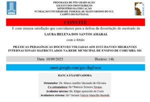 O Curso de Pós-Graduação em Estudos Fronteiriços convida para a Defesa Pública de Dissertação da mestranda Laura Helena Santos Amaral, a ser realizado no dia 10 de Setembro de 2025, às 14:00, virtualmente, sob o título: “PRÁTICAS PEDAGÓGICAS DOCENTES VOLTADAS AOS ESTUDANTES MIGRANTES INTERNACIONAIS MATRICULADOS NA REDE MUNICIPAL DE ENSINO DE CORUMBÁ-MS” contando com os examinadores: