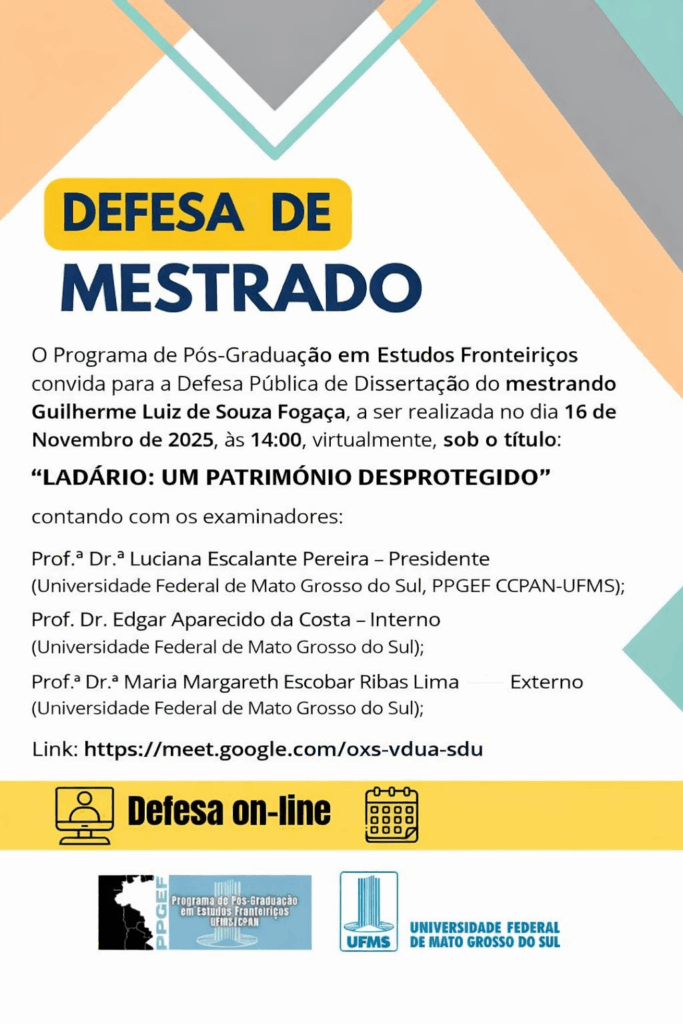 O Programa de Pós-Graduação em Estudos Fronteiriços convida para a Defesa Pública de Dissertação do mestrando Guilherme Luiz de Souza Fogaça, a ser realizada no dia 16 de Novembro de 2025, às 14:00, virtualmente, sob o título: “LADÁRIO: UM PATRIMÔNIO DESPROTEGIDO” contando com os examinadores:
