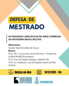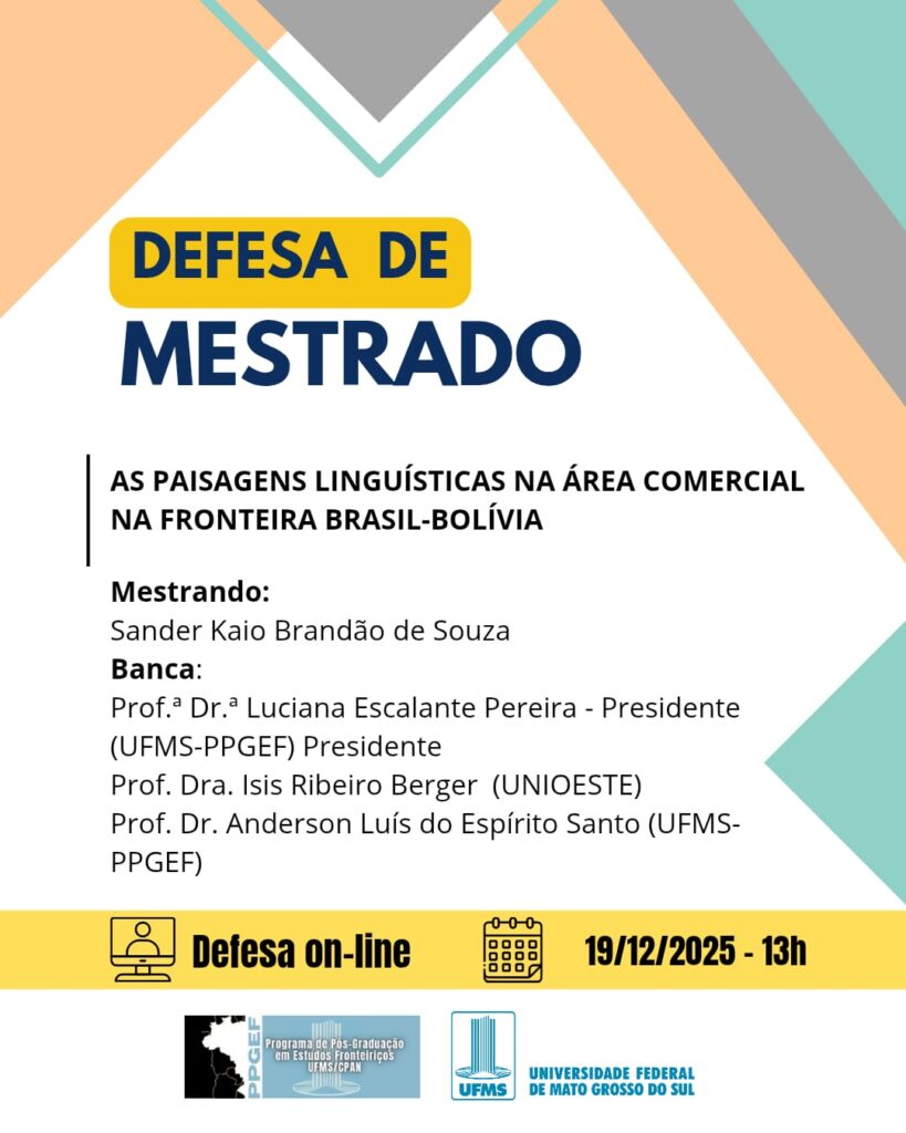 O Programa de Pós-Graduação em Estudos Fronteiriços convida para a Defesa Pública de Dissertação do mestrando Sander Kaio Brandão de Souza, a ser realizada no dia 19 de Dezembro de 2025, às 13:00, virtualmente, sob o título: “As paisagens linguísticas na área comercial na fronteira Brasil-Bolívia Área de Concentração: Interdisciplinar” contando com os examinadores: