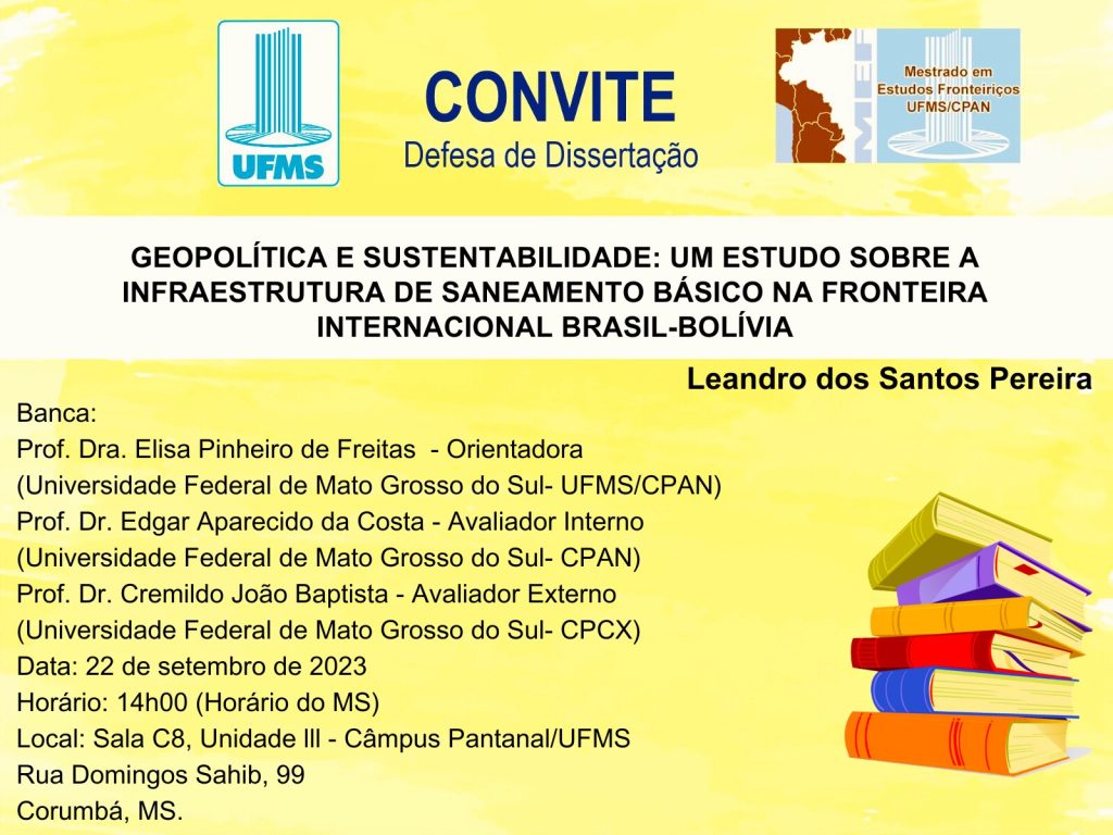 O Curso de Pós-Graduação em Estudos Fronteiriços convida para a Defesa Pública de Dissertação do mestrando Leandro dos Santos Pereira, que acontecerá no dia 22 de setembro de 2023 (sexta-feira).