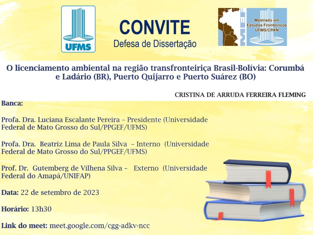 O Curso de Pós-Graduação em Estudos Fronteiriços convida para a Defesa Pública de Dissertação da mestranda CRISTINA DE ARRUDA FERREIRA FLEMING, que acontecerá no dia 25 de setembro de 2023 (segunda-feira).