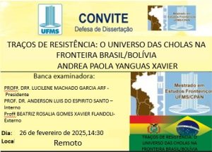 O Curso de Pós-Graduação em Estudos Fronteiriços  convida para a Defesa Pública de Dissertação da mestranda ANDREA PAOLA YANGUAS XAVIER que acontecerá no dia 26 de Fevereiro de 2025 (quarta-feira), virtualmente.
