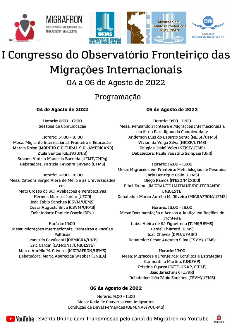 – A Programação completa estará disponível na página do Migrafron (migrafron.ufms.br) a partir do dia 04 de julho de 2022
