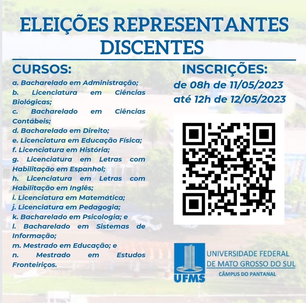 Hoje (12/05/2023) é o último dia para candidatar-se nas eleições para representante discente dos cursos de graduação e pós-graduação do Câmpus do Pantanal – UFMS. Venha participar desse processo de grande importância para a comunidade acadêmica do Câmpus do Pantanal!
