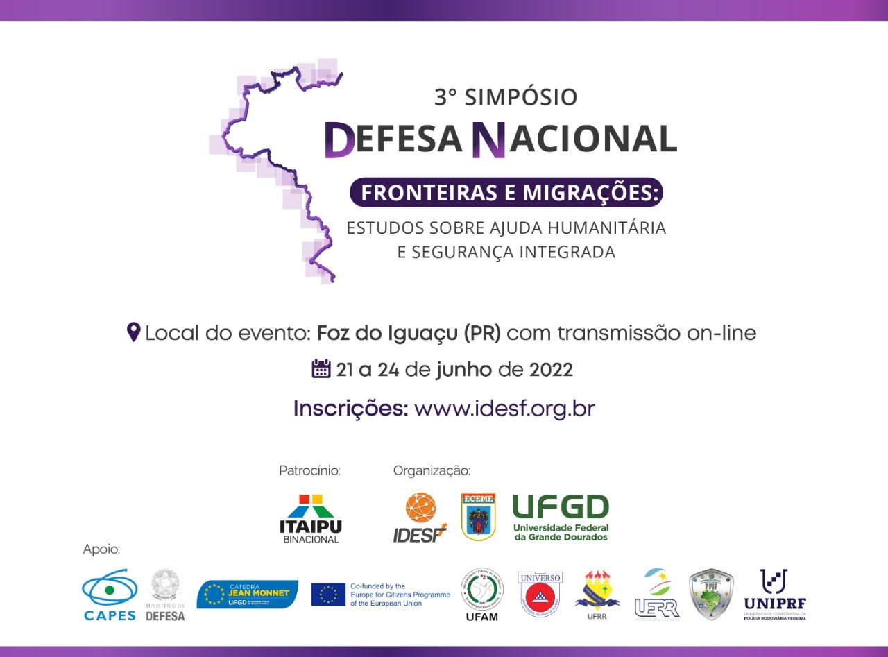 Mais informações e inscrições: https://www.idesf.org.br/2022/05/17/inscricoes-abertas-para-o-3o-simposio-de-defesa-nacional-fronteiras-e-migracoes/