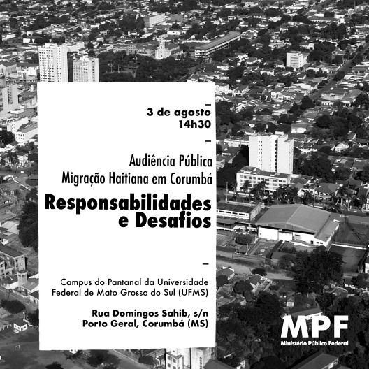 O Ministério Público Federal (MPF) em Corumbá (MS) promoverá, no dia 3 de agosto, audiência pública para debater a situação dos imigrantes haitianos no município. O evento será realizado no auditório da unidade III do campus Pantanal da Universidade Federal de Mato Grosso do Sul (UFMS), a partir das 14h30, e reunirá autoridades públicas, representantes da sociedade civil organizada e imigrantes haitianos.