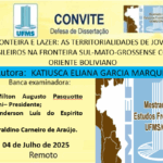 O Curso de Pós-Graduação em Estudos Fronteiriços  convida para a Defesa Pública de Dissertação da mestranda Katiusca Eliana Garcia Marquez  que acontecerá no dia 04 de Julho de 2025 (Sexta-feira), de forma virtual: Título: “FRONTEIRA E LAZER: AS TERRITORIALIDADES DE JOVENS BRASILEIROS NA FRONTEIRA SUL-MATO-GROSSENSE COM O ORIENTE BOLIVIANO”. Local:  Virtualmente: meet.google.com/uss-jqah-fxx. Horário: 13h Data: […]