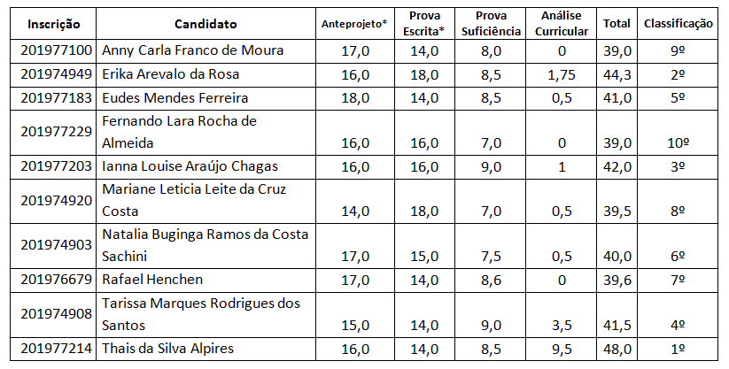 Obs.: Não houve recursos interpostos contra as provas e análise curricular.