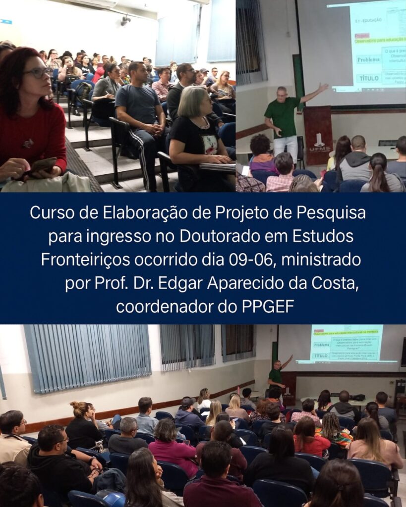 No dia 09 de Junho de 2025, às 18h30, diversos interessados em prestar seleção para o Curso de Doutorado em Estudos Fronteiriços assistiram o Curso de Elaboração de Projeto de Pesquisa, ofertado pelo prof. Dr. Edgar Aparecido da Costa, coordenador dos Cursos de Mestrado e Doutorado em Estudos Fronteiriços.